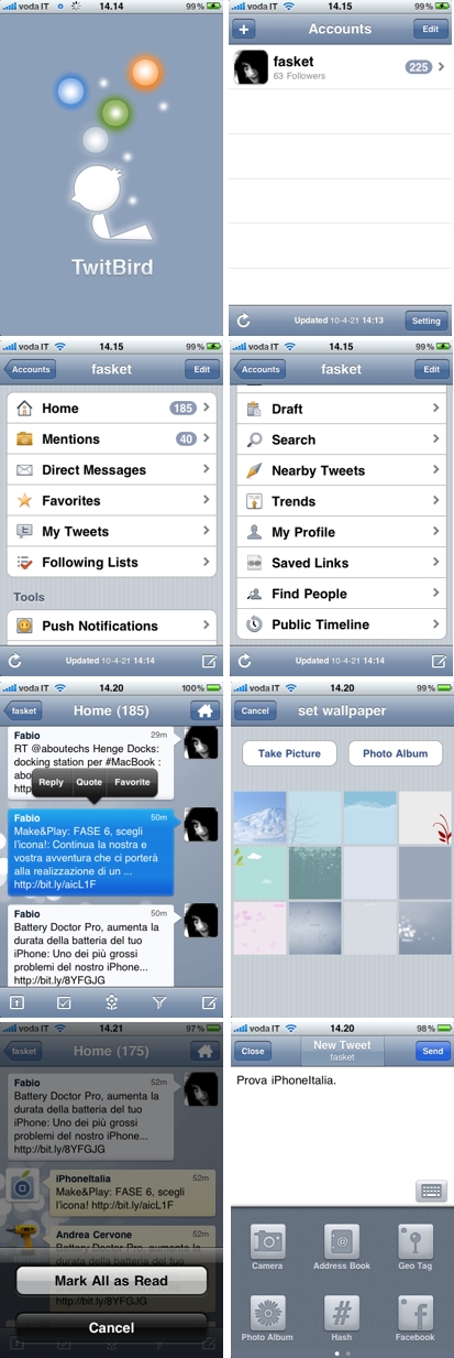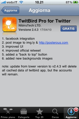 Di recente è stata aggiornata l’ottima applicazione TwitBird Pro (AppStore 2,39 Euro), un client che permette di gestire al meglio il vostro account Twitter direttamente da iPhone.