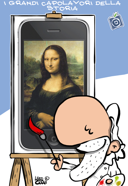 Lele Corvi: ” Considerando l’iPhone un oggetto che sta facendo e farà storia, tendo a paragonarlo a un capolavoro. Un tempo erano i grandi affreschi o le tele di grandi maestri. Oggi la tecnologia. Da qui il fatto di condensare in un unico disegno il telefono e la Gioconda disegnati da Leonardo.