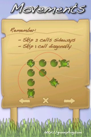 100 Leaps è un nuovo arcade/puzzle game per iPhone. Il simpatico ranocchio dovrà saltare sulle foglie di ninfea per un numero di volte richiesto dal gioco e il tutto verrà reso ancora più difficile dal limite di tempo imposto. Non potremo saltare semplicemente da una foglia all’altra ma bisogna regolarsi in base allo “standard” di salto del ranocchio, cioè due celle in verticale e in orizzontale, 1 cella in diagonale. Il tutto è mostrato meglio nella seguente immagine: