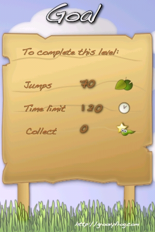Prima di ogni livello viene mostrato il traguardo da raggiungere, nel caso mostrato nell’immagine, bisogna effettuare 70 salti in 120 secondi. Inoltre, in alcuni casi, verrà richiesto di raccogliere un determinato numero di oggetti.