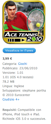 Ace Tennis 2010 Online sviluppato da Eurocenter arriva finalmente su iPhone, dopo essere approdato lo scorso mese su iPad.