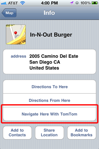 Ma cosa fa questo tweak? Semplice. Una volta trovato un luogo in Google Maps, magari sfruttando la funzione che automaticamente ci mostra la posizione di un contatto, possiamo cliccare sul nuovo tasto “Navigate Here With TomTom” per aprire automaticamente TomTom ed iniziare la navigazione.