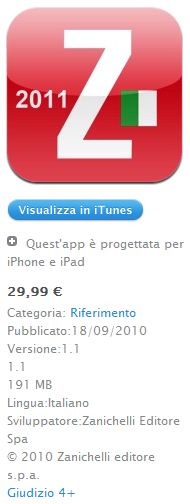 Anche l’edizione 2011 del vocabolario della lingua italiana arriva finalmente su AppStore. Stiamo parlando dello Zingarelli 2011, pubblicato da Zanichelli. Potete scaricare l’applicazione ad un prezzo di 29,99€. Questo il link diretto!