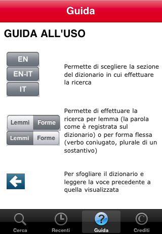 L’applicazione in questione contiene il testo integrale dello Zingarelli 2011 pubblicato da Zanichelli, ricercabile per lemmi. Se si dispone di un collegamento a Internet, è possibile ascoltare la pronuncia corretta di tutti i lemmi cliccando sull’icona a forma di nota musicale ma per sfogliare e consultare semplicemente tutte le voci non è richiesta alcuna connessione. Il tutto è, dunque, visionabile offline.