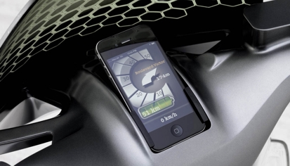 Infatti, prima di avviare “l’elettro-scooter”, bisogna inserire l’iPhone in uno spazio dedicato appositamente, una sorta di dockstation, che troviamo al centro del manubrio. In questo modo iPhone e scooter saranno interconnessi tra loro e a video visualizzeremo varie informazioni riguardanti il veicolo oppure la strada da percorrere.