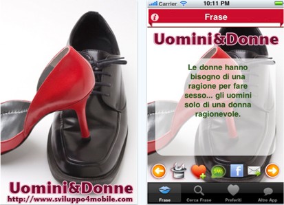 Uomini&Donne porta oltre 2000 frasi smaliziate, divertenti e sarcastiche riguardanti solo e unicamente l’universo degli uomini e delle donne. Come per la precedente applicazione, anche questa permette di condividere il tutto via e-mail, Facebook e SMS. Effettuata l’autenticazione al social network potete pubblicare le frasi nella vostra bacheca oppure in quella dei vostri amici, che potete ricercare all’interno dell’app stessa.