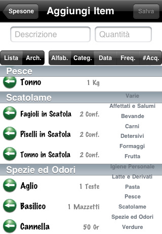 - La lista predefinita può essere ordinata alfabeticamente, per categoria, per data di acquisto, per numero di acquisti e per frequenza di acquisti
