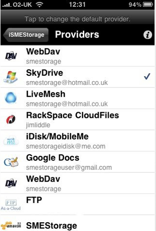 iSMEStorage vi permette di visualizzare, gestire e sincronizzare file per tutti i vostri fornitori di servizi di cloud storage preferiti utilizzando un’unica applicazione. iSMEStorage supporta i seguenti servizi: GoogleDocs, Amazon S3, MobileMe, Microsoft Live Mesh, Microsoft SkyDrive, Box.net, RackSpace Cloud Files, Gmail-as-a-Cloud, EMail-as-a-Cloud, e qualsiasi WebDav abilitato.