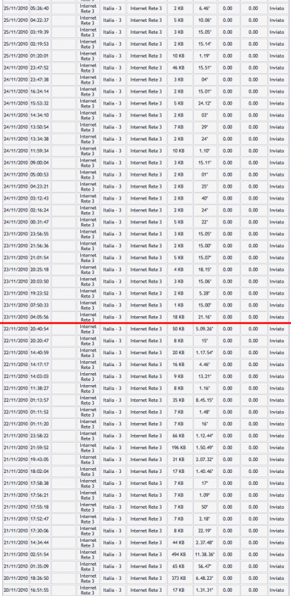 Come si può notare dallo screen che ho preso dal sito Tre, fino al momento in cui non ho aggiornato alla 4.2.1 (marcato dalla linea rossa) il telefono, con le notifiche push ed ogni altra forma di applicazione in background che potesse generare connessioni spontanee disattivati, rimaneva di sua iniziativa collegato alla rete internet per diverse ore proprio come se ci fossero le notifiche push attivate, con lunghe connessioni con poco scambio dati. Finalmente ora, con iOS 4.2.1, la situazione sembra tornata nella norma, come si può vedere al disopra della linea rossa. Sono infatti tornato ai stessi dati che avevo prima che fosse abilitato Game Center.