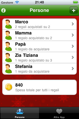 Regali di Natale, l’applicazione disponibile in AppStore, ci aiuterà ad organizzare i regali di natale suddividendoli per persona così che potremo tenere sempre sott’occhio i regali già acquistati, quelli da acquistare, quelli per il proprio babbo, quelli per la mamma, e così via!