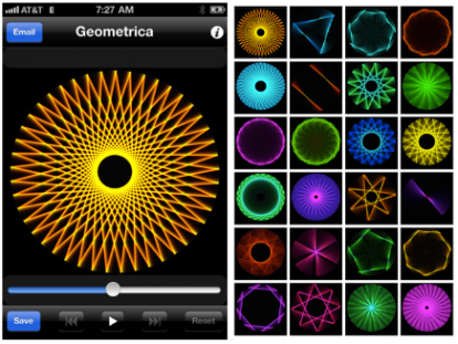 Passando invece all’applicazione gratuita del giorno, troviamo Geometrica. Non si tratta di una semplice applicazione per gli sfondi, ma anche di un elegante ed interattivo visualizer. Utilizzando la slider bar, i controlli mulitouch e la funzione di zoom, potranno essere generati una serie di effetti molto carini e originali. Le immagini potranno essere salvate nel rullino fotografico e utilizzate come sfondo o inviate agli amici per email.