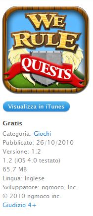 We Rule Quests è il nuovo We Rule di ngmoco dove dovremo dimostrare tutto il nostro valore per ricevere punti esperienza, monete e il giusto rispetto da parte di tutto il regno. L’applicazione di base è gratuitamente disponibile a questo indirizzo, mentre, come al solito, molteplici saranno gli elementi acquistabili attraverso la classica formula dell’in app purchase.