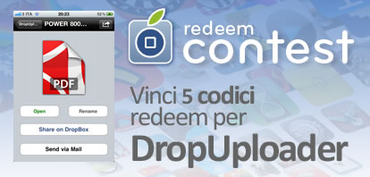 iPhoneItalia Redeem Contest è il nostro concorso quotidiano in cui mettiamo in palio codici promozionali per scaricare gratuitamente e legalmente applicazioni e giochi da App Store. Oggi mettiamo in palio 5 codici redeem per l’applicazione DropUploader , disponibile su AppStore al prezzo di 0,79 €.