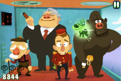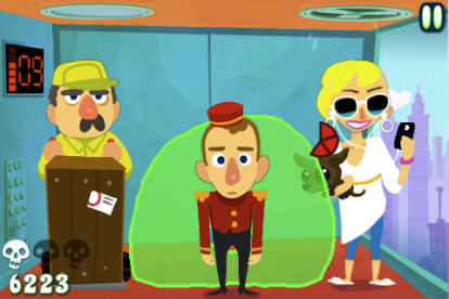 Ma la cosa che mi ha lasciata più stupita è che… Bad Air Day è davvero divertente! Per aiutare Artie a tener vivi i suoi clienti e a non perdere il proprio posto di lavoro, il giocatore deve controllare le nubi mefitiche che lui emette, trascinandole con il dito verso i condotti di areazione in alto, e tenendole lontane dai nasi dei passeggeri. Ma è più facile a dirsi che a farsi, perchè all’hotel Le Fumé la clientela è davvero varia: impegnatissimi uomini d’affari, vecchie signore acide, alieni, socialites, cani di diversi tipi, robot: tutti con nasi in posizioni differenti, attorno ai quali occorre fare una gimcana con le proprie nubi tossiche. Per fortuna le nuvolette emesse sono semplici da controllare e rispondono ad un fisica intuitiva e ben congeniata: si raggruppano e separano con una certa facilità e si trascinano con pochi tocchi.