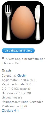 Il titolo e gratuito ed è stato lanciato in AppStore già da molto tempo. Mantenere in equilibrio l’uovo non sarà cosa da poco. Dopo breve inizieranno a tremare le mani e recuperare la situazione non sarà di certo facile. Un counter posto sulla parte alta dello schermo indicherà il tempo da noi raggiunto.