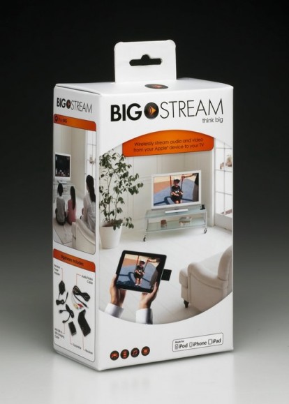 - La confezione di Bigstream include il trasmettiore da connettere al dispositivo Apple, il ricevitore da collegare alla TV/Display, cavo audio/video, cavo di ricarica mini-USB ad USB, alimentatore per il ricevitore, adattatore presa di corrente USA-ITA e Guida d’utilizzo in inglese.