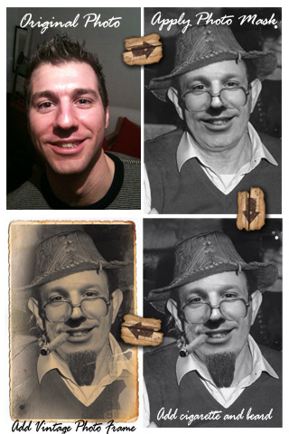 Con Absolute Vintage puoi fare una foto o selezionarla dalla libreria, mettere la tua faccia o quella di un tuo amico dentro al corpo di una persona vestita con un look di 40-60 anni fa, aggiungere accessori come sigarette accese, barba e cappelli, aggiungere quindi un’originale “cornice” alla tua creazione ed infine salvare l’immagine creata.