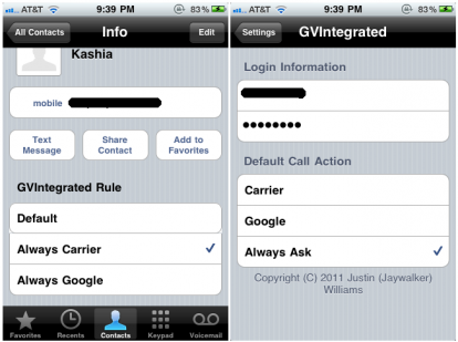 A differenza delle altre applicazioni che consentono di accedere a Google Voice da iPhone – disponibili esclusivamente negli Stati Uniti – GVIntegrated integra alcune funzioni di base di Voice nell’applicazione Telefono di iOS. In questo modo l’utente potrà decidere se contattare normalmente un amico utilizzando la rete GSM o se preferire Google Voice.
