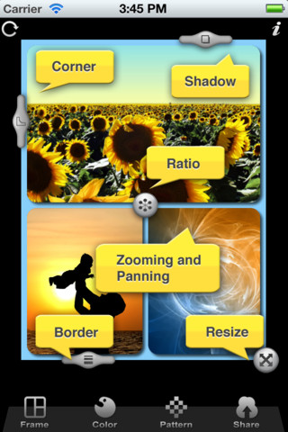 In Frame Magic avremo la possibilità di unire fino a 6 foto in un’unica cornice potendo inoltre modificare colore dello sfondo, rotondità degli angoli, griglia di riferimento e dimensioni delle fotografie.