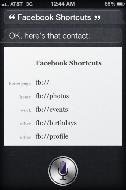Basterà quindi chiedere a Siri di chiamare il contatto Facebook Shortcuts per far comparire i vari url inseriti, quindi basterà chiamare quello desiderato per avviare l’app. Lo stesso può essere fatto con altre tipologie di contatto, che potete chiamare come preferite, e nei quali dovete inserire i seguenti URL:
