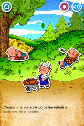 Come in tutte le fiabe di questa collana in “I Tre Porcellini” le illustrazioni sono molto curate e i personaggi oltre ad essere dolci e buffi, sono stickers che i bambini potranno spostare sullo schermo del vostro iPhone, iPod o iPad con un dito, caratteristica particolarmente in grado di divertire. La fiaba può essere letta per conto proprio oppure la si può far raccontare alla simpatica narratrice tramite semplici tocchi sull’apposito bottoncino.