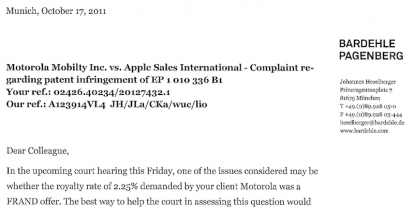 Nella missiva inviata alla Commissione Europea, Apple ritiene che la richiesta di Motorola per la concessione di tali brevetti (il 2,25% di tutti i guadagni provenienti dalle vendite degli iPhone e degli iPad 3G) siano troppo esose, irragionevoli e discriminatorie.