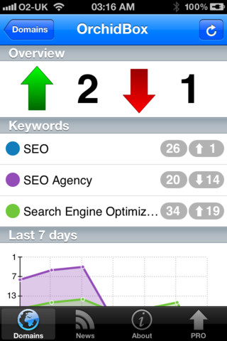 iRank è un’applicazione che permette di controllare l’andamento del proprio sito, quindi la posizione SEO, in base al monitoraggio delle parole chiave. Esistono diversi accorgimenti per migliorare il SEO del proprio sito e iRank consente di monitorare gli eventuali miglioramenti direttamente da iPhone, con grafici che mostrano lo stato giorno per giorno, fino ai tre mesi precedenti.