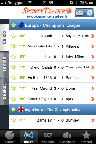 SportyTrader è un’applicazione per iPhone che permette di visualizzare tutti i risultati sporti in tempo reale per quanto riguarda calcio, basket e tennis direttamente dal proprio telefono. L’app rappresenta anche una risorsa utile per le scommesse sportive in quanto permetterà di accedere a pronostici e consigli di SportyTrader.it, a prescindere dalla nostra posizione; le quotazioni verranno messe a confronto tra i vari siti sportivi inerenti ai prossimi incontri, così da darci una migliore idea di come comportarci. SportyTrader attraverso l’interfaccia consentirà di conoscere l’andamento delle partite di calcio in diretta, di visualizzare i livescore degli incontri di tennis e quelli di basket, e potremo impostare degli avvisi inviati come notifiche per essere costantemente aggiornati; è inoltre presente la possibilità di conoscere classifiche, formazioni in campo, nomi dei marcatori e giocatori ammoniti o espulsi, riassunti del match e delle statistiche, calendario degli incontri futuri e molto altro.