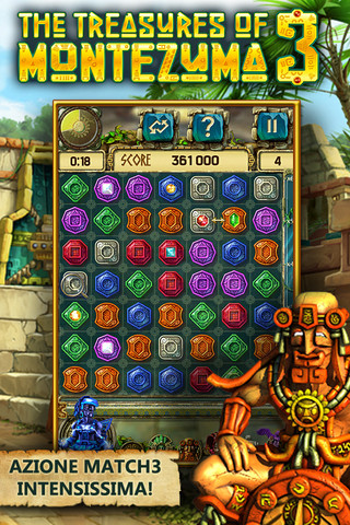 In The Treasures of Montezuma 3 dovremo allineare i gettoni e sbloccare incredibili ricchezze. Con oltre 200 livelli, effetti visivi straordinari, un audio esplosivo e scenari fantastici in grado di superare i confini dell’arte nei giochi casual, The Treasures of Montezuma 3 è un titolo che non può mancare nella collezione dei fan del genere match-3. The Treasures of Montezuma 3 metterà alla prova le nostre abilità mentre tenteremo di accumulare il massimo dei punti in un minuto. Grazie ai totem magici potremo inoltre eseguire numerose combo: utilizzando i poteri dei totem in modo strategico potrai raggiungere punteggi sufficienti per ottenere stelle magiche che, a loro volta, consentono di potenziare al massimo gli oggetti bonus. Potremo anche aggiungere ulteriori stelle completando le fasi puzzle senza tempo che compaiono tra alcuni livelli.