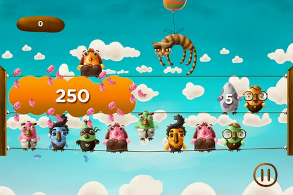 Sui tre cavi dell’alta tensione, siedono alcuni uccelli diversi tra loro. Con un dito è possibile scambiarli di posto, sia verso destra/sinistra ma anche su e giù (cambiando cavo). Trattandosi –come già detto– di un match-3, il nostro compito consiste nel creare delle combinazioni mettendo vicini almeno tre uccelli dello stesso colore. Questi spariranno dal video e il nostro punteggio verrà incrementato. A lungo andare, il cavo più in basso si “popolerà” sempre di più e dovremo essere veloci nel creare il maggior numero di combinazioni possibili. Ovviamente, più saranno le combinazioni e più alto sarà il punteggio finale. Ad aumentare il grado di difficoltà, un dispettoso gattino che, servendosi di un palloncino, cercherà di rapire qualche uccello dalla linea più alta e che dovete assolutamente evitare.