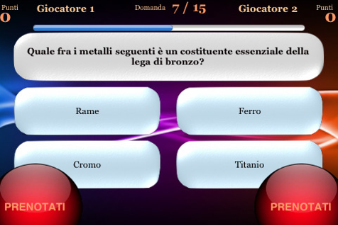 Master Quiz è il nuovissimo trivial game che dispone di migliaia di domande, tutte rigorosamente scritte e pensate per giocatori italiani. Le domande spaziano nelle più diverse categorie, dalla storia all’attualità, dalle scienze alla religione, dallo sport al cinema… Potrete divertirvi per ore e ore, mettendo a dura prova la vostra cultura. Avrete a disposizione diverse modalità di gioco in singleplayer, nonchè la possibilità di fare avvincenti sfide testa a testa contro i vostri amici. Metti alla prova la tua cultura e sfida i tuoi amici in preparazione e velocità. Un must tra i trivia games. L’unico che vi permette di affrontare sfide multigiocatore faccia a faccia con il vostro avversario. E ricorda: quanto più veloce sarà la risposta, tanti più saranno i punti che guadagnerai. Tienine conto se vuoi conquistare il record mondiale Master Quiz.