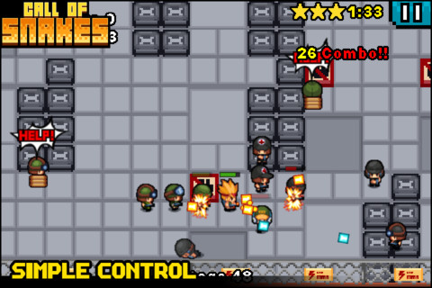 Call of Snakes si basa su un concept molto semplice e proprio a tale scopo offrirà un sistema di controllo altrettanto semplificato con degli scontri armati. Girando per il livello con il nostro piccolo personaggio pixellato dovremo sparare ai nemici recuperando gli alleati intrappolati, ed ogni volta che ne recupereremo uno questi si accoderà dietro a noi migliorando la nostra potenza di fuoco. Il gioco include una modalità multiplay online tramite il Game Center e saranno disponibili 6 personaggi giocabili che occuperanno il ruolo dei leader. La modalità campagna include 50 livelli, ma sarà anche presente una modalità Arcade.