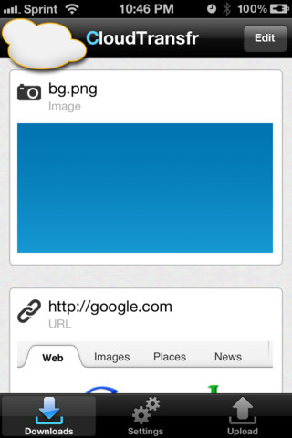 Quest’applicazione permetterà di spostare rapidamente i files, gli URLs e quasi qualsiasi altra cosa da computer al nostro iPhone o iPad. Potremo trasferire immagini, testo, urls, direzioni su Google Maps, documenti Word, Excel, ecc., e spostarli sul nostro iDevice. Le notifiche Push ci avvertiranno quando il nostro dispositivo riceverà qualche documento o file da noi inviato, e potremo salvare le immagini alla nostra galleria, copiare il testo sulla clipboard ed aprire le mappe nella rispettiva applicazione, e tutto questo senza dover usare il Wi-Fi ma anche il 3G. Il funzionamento è semplice: dovremo effettuare il login su CloudTransfr.com, selezionare il dispositivo dalla lista, inviare il file desiderato e successivamente il nostro device riceverà quanto inviato tramite una notifica Push. Applicazione universale.