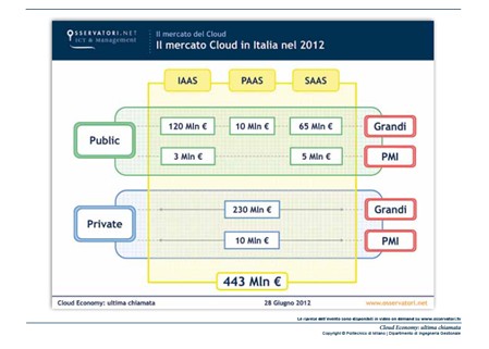 In questo quadro il Cloud è per le Imprese e Pubbliche Amministrazioni italiane un’opportunità unica di accedere alla digitalizzazione saltando quei gap di risorse investite e competenze da troppo tempo accumulati nell’ambito dell’ICT tradizionale. Il mercato Cloud nel 2012 è stimabile in 443 Mln di Euro, pari al 2,5% di tutta la spesa IT sostenuta in Italia.