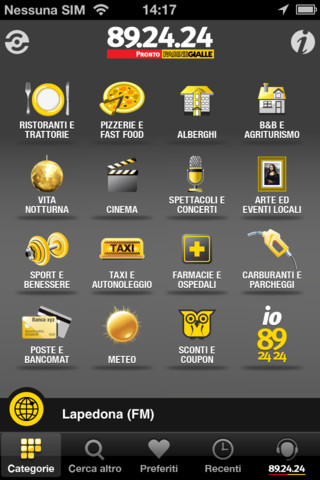 Sarà come avere gratuitamente sul tuo iPhone tutta la qualità e l’affidabilità di 89.24.24 e dei suoi Assistenti Personali: il servizio di informazioni e soluzioni conosciuto da tutti. Si tratta di un’ottima applicazione per scegliere cosa fare, ed infatti semplicemente utilizzandola potremo ricevere suggerimenti in merito ai locali di tendenza, il ristorante di sushi, pizzeria d’asporto, cucina tipica, locali della Guida Michelin, il cinema più vicino, sagre ed venti culturali ed altro ancora. Oltre a questi inoltre verranno mostrati uffici postali con tanto di orari di apertura, sportello Bancomat, stazione di carburante o GPL/metano, servizio taxi ed infine potremo eseguire ricerche di attività in base a numero di telefono, dettaglio con l’indirizzo email, sito web ufficiale e molto altro. Tutti i risultati potranno essere visualizzati su mappa o attraverso la Realtà Aumentata.