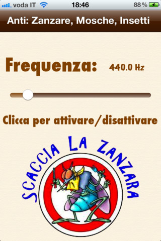 Anti insetti ha una grafica molto semplice con un tasto per attivare e disattivare il suono e uno “slide” che permette di regolare la frequenza così che non crei disturbo al vostro udito come accade con le altre app che hanno delle frequenze pre-impostate e creano disturbi all’orecchio.
