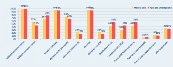 Relativamente al dettaglio delle funzionalità offerte sulle due piattaforme tecnologiche più innovative, le App e i Mobile Site, dal confronto non emerge nessuna differenza rilevante: il 100% delle banche che offrono servizi su queste piattaforme sono partite dal saldo e lista movimenti del conto corrente.