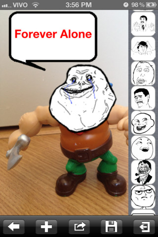 E’ possibile aggiungere un numero qualsiasi di meme e potranno essere liberamente ruotati, rigirati, zoomati e rimossi. Le fotografie possono essere sia prese dal Rullino fotografico che scattate attraverso la fotocamera del dispositivo ed il risultato può essere facilmente condiviso su Twitter e Facebook.