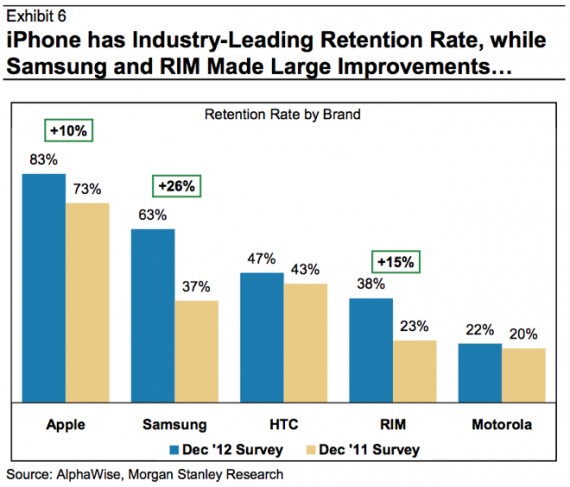 Dalla stessa indagine emerge anche che gli acquirenti iPhone sono quelli che rimangono più fedeli al dispositivo, dato che l’83% dichiara di voler acquistare anche in futuro nuovi smartphone Apple. La percentuale è aumentata del 10% rispetto al 2011. In questa classifica, Samsung si posiziona al secondo posto con il 63% di fidelizzazione degli utenti, ma anche con una crescita di ben 26 punti percentuali rispetto a 12 mesi fa.