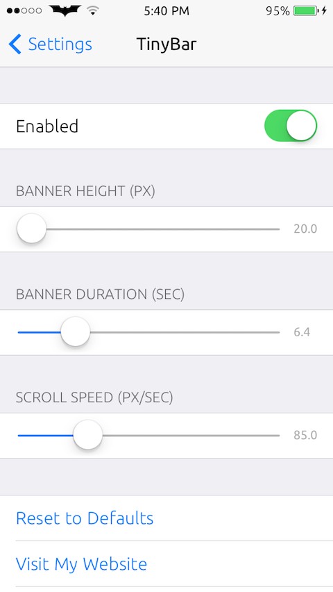 Le notifiche banner di iOS 7 sono diventate più “grasse” rispetto a quelle di iOS 6. I banner di notifica, infatti, occupano ora uno spazio maggiore all’interno dell’interfaccia di iOS. Se questo è in parte giustificato dal fatto che le nuove notifiche contengono più informazioni rispetto al passato, dal punto di vista dell’utente possono non essere proprio comodissime in alcune situazioni, dato che vanno a nascondere parte dell’interfaccia. TinyBar è un nuovo tweak per dispositivi iOS jailbroken che permette di risolvere questo problema, andando a ridurre le dimensioni dei banner e consentendo all’utente di personalizzarne le dimensioni.