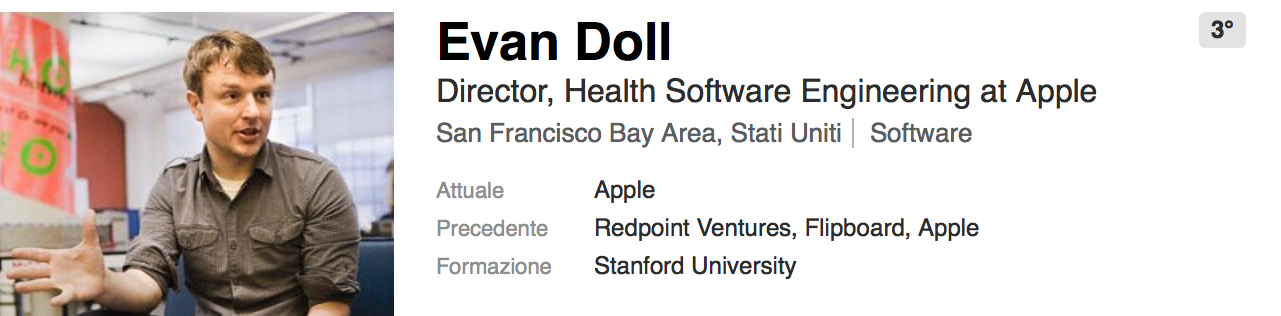 L’assunzione di Doll sarebbe avvenuta in silenzio il mese scorso. Evan Doll è ora “Director, Health Software Engineering at Apple”. Non è chiaro su cosa Doll stia lavorando nello specifico ma è sicuro si tratti del campo “salute e benessere”. Doll ha lavorato in Apple dal 2003 al 2009 su iOS.