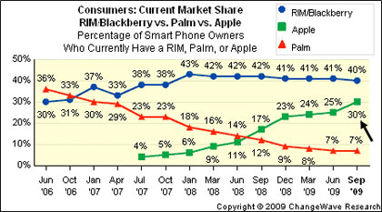 Dagli ultimi dati pubblicati dalla ChangeWave, infatti, emerge che l’iPhone è passato dal 25% al 30% di quota mercato in soli tre mesi, mentre il Blackberry ha perso un punto percentuale, passando dal 41% al 40%.