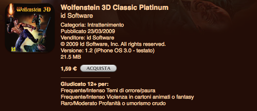 • Wolfenstein 3D Classic: il mitico FPS che abbiamo recensito qui. Numerose le novità: 21 nuove mappe, 5 nuovi boss, nuovi nemici, possibilità di scaricare mappe custom, possibilità di zoomare in-game tramite doppio tap, sezione trivia id Software, scrolling nella mappa