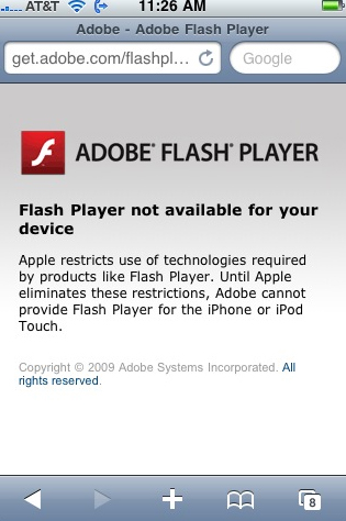 Apple applica delle restrizioni nell’uso della tecnologia richiesta da prodotti quali Flash Player. Fin quando Apple non eliminerà queste restrizioni, Adobe non può implementare Flash Player su iPhone ed iPod Touch.