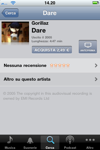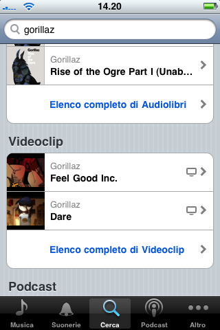Al momento manca ancora una sezione specifica dedicata ai videoclip, per cui l’unico modo per accedervi tramite iPhone è cercare un particolare artista (ad esempio Gorillaz) e selezionare i videoclip disponibili.