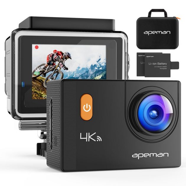 - Apeman 4K – Macchina fotografica impermeabile di azione sportiva Wi-Fi 20MP 170° Grandangolare 2.0 Pollici due 1050mAh Batterie con Custodia Impermeabile e Kit di accessori, Nero da 85,99€ a 64,99€