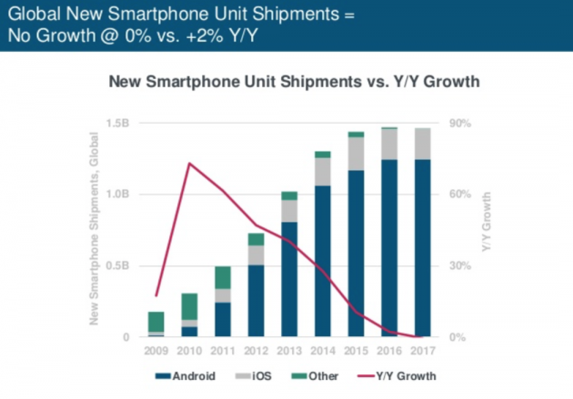 In primis, Meeker evidenzia un periodo stagnante per il mercato smartphone, con i dati che confermano come le spedizioni non siano cresciute durante il 2017. Inoltre, la crescita dell’utilizzo di Internet ha subito un rallentamento drammatico, con un aumento del 7% nel 2017 rispetto al 12% nell’anno prima.