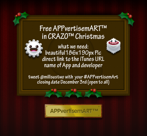 CRAZO è un’applicazione natalizia, con sfondi e suoni dedicati alla festività e, proprio in occasione del lancio, gli sviluppatori offrono la possibilità di pubblicizzare 10 applicazioni AppStore gratuitamente, con banner da inserire in CRAZO.