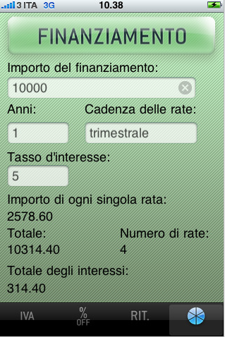 In pratica si tratta di una offerta, che al prezzo 1,59€ implementa tre applicazioni singole (iFinanziamento – Sconto – Ritenuta d’acconto) disponibili al prezzo di 0,79€ l’una (le ultime due sono ancora in fase di approvazione).