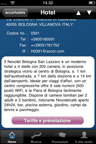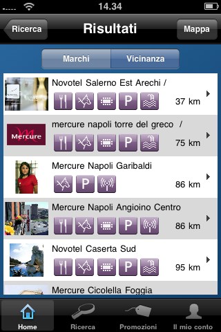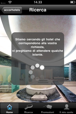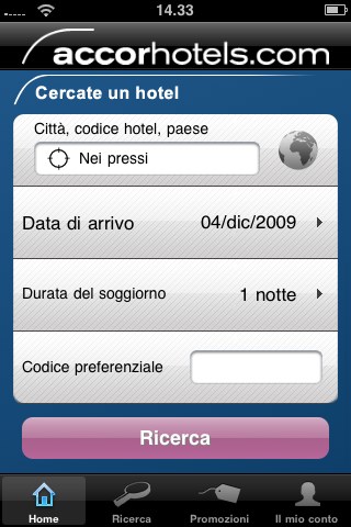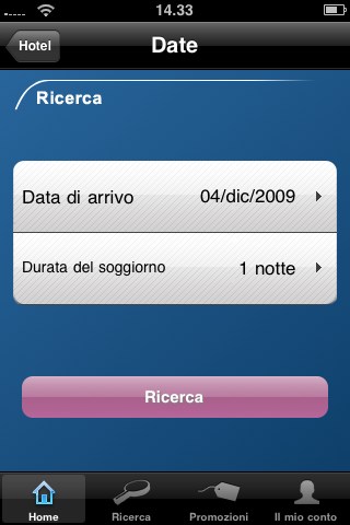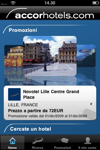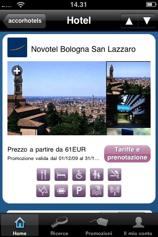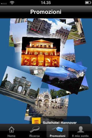 Dalla Home abbiamo la possibilità di dare uno sguardo alle promozioni correnti, offerte che provengono da ogni hotel del mondo e che possono essere sfogliate in cover flow, e di cercare un albergo specifico sia per nome che per luogo e data di soggiorno (in questo modo verranno mostrati solo gli hotel che hanno delle stanze libere nel lasso di tempo selezionato). La ricerca può essere effettuata anche in base alla nostra posizione, mostrandoci gli alberghi più vicini.